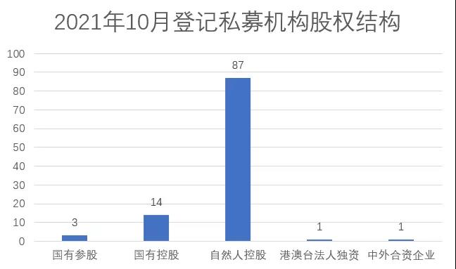 上圖為2021年10月登記私募基金管理人股權(quán)結(jié)構(gòu)圖。在2021年10月登記的106家私募基金管理人中,有87家私募基金管理人完全由自然人股東出資,占比約82.07%。有14家為國(guó)有控股,有3家為國(guó)有參股,有1家港澳臺(tái)法人獨(dú)資,1家中外合資企業(yè)。
